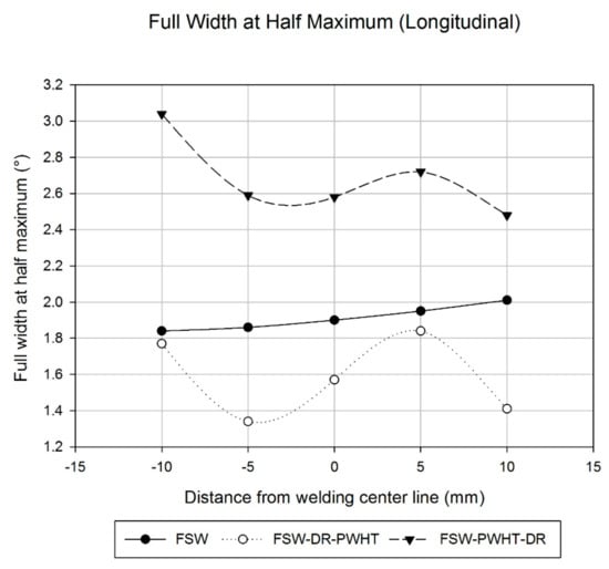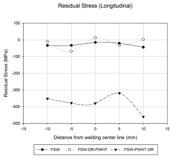 Concerning the FSW-DR-PWHT workpiece, it was revealed that the surface residual stress value of the AS decreased from −9.9 MPa to −68.1 MPa at positions −10 mm and −5 mm from the welding center line, respectively. The corresponding SZ was about 13.5 MPa, and the RS value was found to increase from −33.5 MPa to 3.2 MPa at positions 5 mm and 10 mm from the welding center line, respectively. The surface residual stress value obtained concerns both tensile residual stress and compressive residual stress of the welding area as well as the FWHM value at positions −5 mm and 5 mm from the welding center line, which revealed a lowest value of about 1.34° and a highest value of about 1.84°. Therefore, the FSW-DR-PWHT workpiece is expected to have a shorter fatigue life than that of the FSW workpiece due to the last treatment process it underwent: the PWHT process, which caused residual stress and FWHM to relax after artificial aging treatment. The results are consistent with the reference [10,18]. Comparatively, the FSW-PWHT-DR workpiece revealed a reduced surface residual stress at AS, from −352.1 MPa to −378.2 MPa at positions −10 mm and −5 mm from the welding center line, respectively, with a SZ of about −379.8 MPa; at the RS, the value was reduced from −319.4 MPa to −460.2 MPa at positions 5 mm and 10 mm, respectively, from the welding center line.
