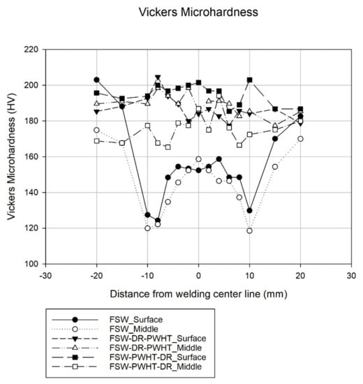 All workpieces in the base material at the position of −20, −15, 15, and 20 mm from the welding center line can be considered as having similar values, with a microhardness of approximately 185 HV, as shown in Figure 13. The SZ of the FSW workpiece, both at the surface and at the middle of the workpiece itself, had a uniform microhardness of approximately 150 HV, which is lower than that of the base material. The lowest microhardness point of the FSW workpiece was located in the thermo-mechanically affected zone (TMAZ) both on the AS and the RS, with a microhardness of approximately 125 HV. It was found that, for the FSW-DR-PWHT workpiece, microhardness was almost uniformly consistent throughout the surface and the middle of the workpiece, with a microhardness of approximately 188 HV, and similar results were reported elsewhere [3]. This is was the highest recorded microhardness among all the workpieces concerning this middle area. The microhardness of the FSW-PWHT-DR workpiece was found to be approximately 195 HV almost uniformly throughout the surface, the highest microhardness found among all the workpiece surface areas. This is because the DR process is the last step in surface improvement, resulting in the near- surface area of the workpiece FSW-PWHT-DR having the highest surface microhardness due to local plastic deformations, resulting in work hardening. The microhardness value of FSW-PWHT-DR at the middle of the workpiece was found to have the same consistency, with an average microhardness of 175 HV, which was a lower microhardness than that of the surface of the workpiece.