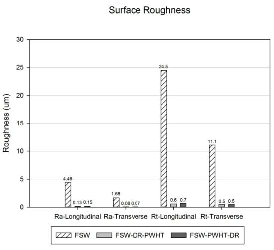 Surface roughness results are shown in Figure 14. It was found that the Ra value decreased in the longitudinal direction from 4.46 µm to 0.13 µm and 0.15 µm and from 1.68 µm to 0.08 µm and 0.07 µm in the transverse direction concerning the FSW, FSW-DR-PWHT, and FSW-PWHT-DR workpieces, respectively. The Rt value revealed the same tendencies as that of the Ra value, which decreased from 24.5 µm to 0.6 µm and 0.7 µm in the longitudinal direction as well as from 11.1 µm to 0.5 µm and 0.5 µm in the transverse direction for the FSW, FSW-DR-PWHT, and FSW-PWHT-DR workpieces, respectively. In comparison, it was found that the FSW-DR-PWHT and FSW-PWHT-DR workpieces had a similar surface roughness value, which can be considered as being equal. Furthermore, the surface roughness of the longitudinal direction was found to be close to that of the transverse direction due to the pressure involved in the DR process, which makes the surface smooth and consistent. Both of these workpieces had to undergo the DR process, although the sequence in which the DR and PWHT processes were applied differed. In comparison, it was found that the FSW workpiece that did not undergo the DR process had a noticeably greater roughness than the workpiece that did undergo the DR process. Accordingly, it can be concluded that the DR process improved the surface (decreased the value of surface roughness) of the FSW workpiece to a level equivalent to that of the surface roughness of the grinding process.