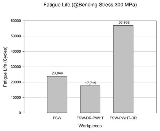 The FSW workpiece was found to have compressive residual stress around the welded area, which differs from conventional fusion welding, where the welded area has a tensile residual stress that results in FSW workpiece resistance to fatigue load at a certain level but not to the same degree as that seen in the FSW-PWHT-DR workpiece. The FSW-DR-PWHT workpiece was found to have the lowest fatigue life due to the last treatment process it underwent, the PWHT process, which caused residual stress to relax during aging treatment, and similar results were reported elsewhere [3,10]. This is explained by the Zener–Wert–Avrami function.
