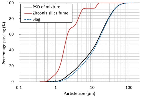 Ground granulated blast furnace slag (GGBS) was employed as the source material. The Blaine fineness and the specific gravity of the GGBS were 4320 cm2/g and 2.92, respectively. Table 1 shows the chemical compositions of the GGBS. Zirconia silica fume (ZSF) containing a small amount of zirconium was used as a supplementary material. Table 1 shows the chemical compositions of ZSF. The specific surface area of ZSF, measured by the Brunauer, Emmett, and Teller (BET) method of adsorption of nitrogen gas, was 7.05 m2/g. The chemical compositions of the GGBS and ZSF were measured by the X-ray fluorescence (XRF) technique (Model: Axios Minerals). Calcium hydroxide and sodium sulfate were used as the activators of the binders, and mixed in the form of powder to prevent quick setting.