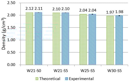 Figure 2 shows the measured density and the theoretical density of the mixtures. The theoretical density was calculated using the density of the component materials and their proportion in each mixture. The difference in density was determined to be less than 0.5%, which indicated that unintended pores were not generated during the specimen’s manufacture or curing. This confirmed that the properties of the composites were not affected by unintentional large pores.