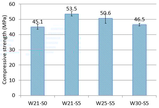Figure 3 shows the compressive strength of each mixture. The maximum coefficient of variation was 6.2%. Replacing 5% of the total amount of the binding materials with ZSF increased the compressive strength by 18.8%. This may be because ultra-fine ZSF particles undergo the pozzolanic reaction, and increase packing density, making the microstructure denser. In the mixtures that included ZSF, strength declined as the water-to-binder ratio was increased. The compressive strength of the W30-S5 mixture, prepared by replacing 5% of the total amount of the binding materials with ZSF, and with a water-to-binder ratio of 30%, was similar to that of the reference mixture.