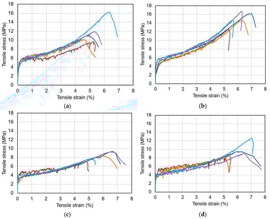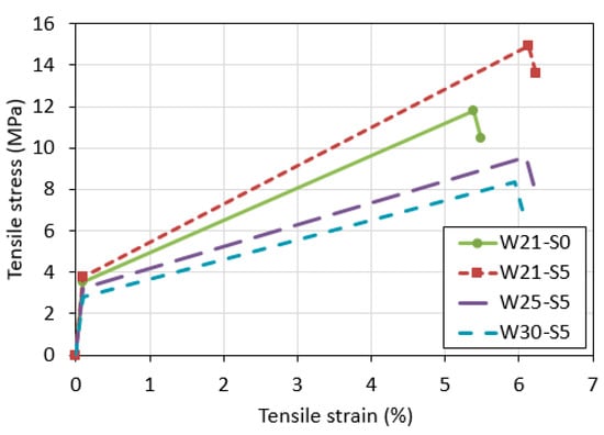 Tensile stress and strain curves: (a) W21-S0, (b) W21-S5, (c) W25-S5, and (d) W30-S5.