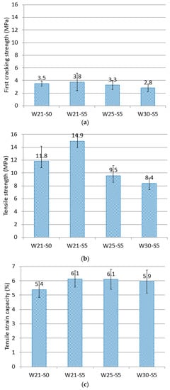 Figure 6 shows the first cracking strength, tensile strength, and tensile strain capacity, which represent the tensile performance of the individual mixtures. The first cracking strength means the stress measured at the generation of the first crack in the specimen, defined as the point on the tensile stress and strain curve where the stress is drastically changed [31]. Tensile strength refers to the maximum tensile stress. Tensile strain capacity is defined as the strain corresponding to the tensile strength.