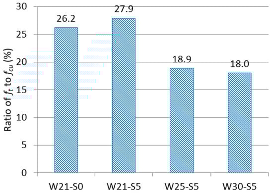 Figure 7 shows the ratio of tensile strength (ft) to compressive strength (fcu). In normal concrete, the ratio of tensile strength to compressive strength is approximately 10% [34]. By comparison, the ratio of tensile strength to compressive strength found in the composites investigated in the present study was very high.