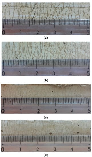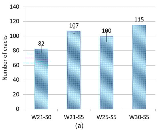 Figure 9 shows the cracking pattern of the mixtures investigated in the present study. Fine multiple cracks were generated in all the mixtures. Figure 10 shows the average number of cracks, the crack spacing, and crack width of the individual mixtures within the gauge length (80 mm), to quantitatively represent the cracking patterns.