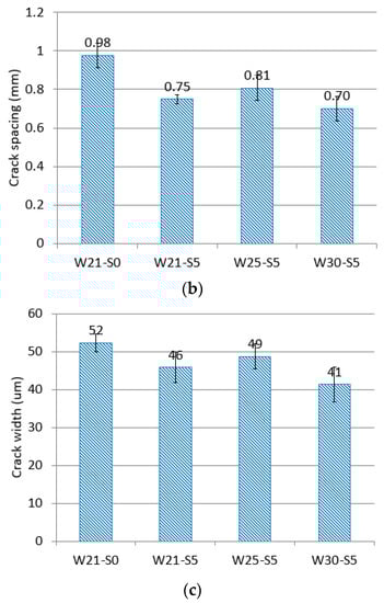Average cracking patterns: (a) number of cracks within gauge length (80 mm), (b) crack spacing, and (c) crack width.