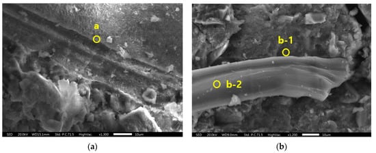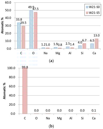 Figure 11 shows SEM images of the W21-S0 specimen and the W21-S5 specimen. As shown in Figure 11, there was no significant difference in the morphology and microstructures of the W21-S0 and the W21-S5 specimens. Next, the chemical compositions of each point shown in Figure 11 were analyzed by EDS, and the results are shown in Figure 12. Positions besides fibers were selected to identify the chemical composition of the matrix, and one position on the fiber was selected to identify the chemical composition of the fiber. A higher amount of silicate was observed in the W21-S5 specimen with added ZSF than the W21-S0 specimen. It seems that the observation of carbon at both positions is due to the fiber. The fiber was damaged during fiber pullout, which may have left a fiber component on the surface of the matrix. Most of the chemical composition of the fiber surface was carbon.