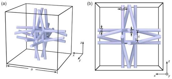 The architecture shown in Figure 1 has been inspired by the one introduced in [12]. It is composed of helical wire bundles, each bundle with four individual wires or beams. The different bundles are connected via small cubic elements and are arranged on a simple-cubic translational lattice, leading to a 3D cubic chiral mechanical metamaterial. The constituent material (gray) shall be describable by ordinary linear Cauchy elasticity [13]. Chiral objects are distinct from their mirror image, hence chiral structures lack centrosymmetry, mirror symmetries, and rotation-reflection symmetries [14,15,16]. However, any effect of chirality of the mechanical metamaterial goes beyond the regime of Cauchy elasticity. In other words, chirality plays strictly no role in a Cauchy continuum [13]. In sharp contrast, Eringen micropolar elasticity [17,18] (sometimes also loosely referred to as Cosserat elasticity) and Willis elasticity [19] can describe effects of chirality and have led to good agreement with previous experimental results on 3D mechanical metamaterials [18] in the static regime. Various other chiral mechanical lattices have recently also been investigated in the static regime [18,20].