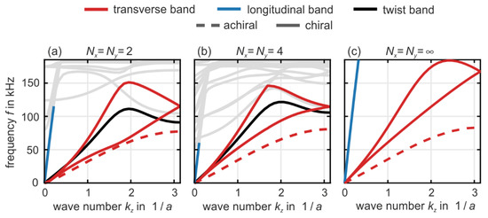 To ease the discussion, we have colored the bands in Figure 2 (see legend). However, this coloration has to be taken with a grain of salt because most bands are mixed in character. For example, in the presence of chirality, the longitudinal pressure bands (blue) and the twist bands (black) are mixed. This mixture is the immediate dynamic counterpart of the (quasi-)static push-to-twist conversion [18] (also see [21]). Furthermore, the transverse polarized bands or shear modes or TA phonons (red), which are strictly speaking flexural modes for beams with finite cross section, exhibit avoided crossings with localized (“optical”) modes at higher frequencies in the middle of the first Brillouin zone around . These higher-frequency bands are plotted in light gray because they are of lesser importance in the context of this article. The dashed red curve shows the two degenerate transverse bands in the achiral reference case. Here, each wire in the bundles of four (cf. Figure 1) is parallel to a principal cubic axis, i.e., we have eliminated the twisting of the bundles (not depicted). By comparison with the red chiral case in Figure 2, we see that chirality leads to a significant stiffening of the structure, thus to an increase of the phase velocity of the transverse bands.