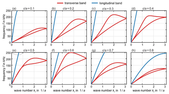 In Figure 2, we show numerically calculated phonon band structures (i.e., eigenfrequencies versus wave number) of metamaterial beams based on the crystal unit cell depicted in Figure 1. The geometrical and polymer material parameters are given in the caption of Figure 1. The calculations in Figure 2 refer to metamaterial beams with a cross section of unit cells (as indicated). The metamaterial beams are infinitely extended along the propagation direction of the waves (-direction, wave number ). These solutions have been obtained by using the eigenmode solver MUMPS in the software package Comsol and by using Bloch-periodic boundary conditions along the -direction.
