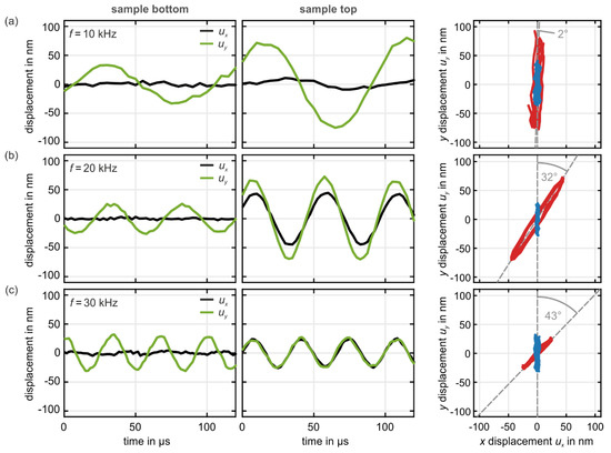Example raw data for three selected excitation frequencies f are depicted in Figure 5. Here, and . We show the individual - and -components of the displacement vector versus time at the sample bottom (left column) as well as at the sample top (middle column).