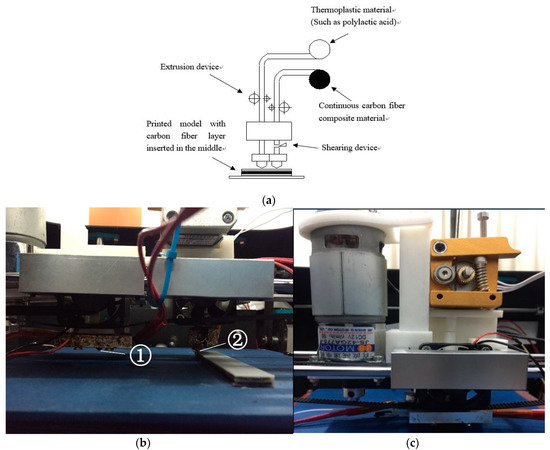 In the 30 years of the development of additive manufacturing technology, 3D printing has gradually broken through the product design concepts for manufacturing process and achieved the product design concepts for the performance of products [1]. This technology is widely used in automobile manufacturing, aerospace, military, medical, construction, education and scientific research [2,3,4]. Carbon fiber (CF) is a new type of 3D printing material. The CF 3D printing products can have excellent performance and light weight characteristics compared to metal materials [5,6]. The traditional manufacture of carbon fiber models is mostly formed by different molds under a certain temperature and pressure. In this way, the manufacturing cost is high and the time is long [7,8]. However, carbon fiber materials combined with 3D printing technology can form complex models at a low cost and high efficiency. According to traditional thermoplastic material 3D printing, it has the characteristics of low cost and easily used equipment which has been widely used in modeling design and verification [9,10]. However, it is difficult to satisfy the performance requirements by the traditional thermoplastic materials 3D printing method [11]. Although the pure continuous carbon fiber 3D printing models have better performance, this method has weaknesses, such as higher cost, longer molding time, and a number of key technologies are still being further studied. Therefore, the 3D printing process reported here, which uses continuous carbon fiber composite material to selectively enhance the thermoplastic model, can combine the advantages of both the above and further expand the application range of 3D printing.