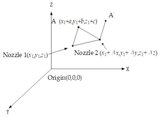 Since the nozzle moves to the print point in the G code file, the nozzle 1 is the original position of the coordinate system, and the distance between the two nozzles needs to be set when the nozzle is switched. The whole nozzle position conversion is shown in Figure 4. Assuming that the origin of the printing platform is (0, 0, 0), the position of the nozzle 1 is (, , ), and assuming that the distance of the nozzle 2 relative to the nozzle 1 is (, , ), then the position of the nozzle 2 in the printing platform is (,,). When the nozzle 1 moves to point A (, , ) in the coordinate system with the nozzle 1 as the origin, the position of the nozzle 1 in the printing platform becomes (, , ). When the nozzle 2 is also moved to point A, nozzle 2 in the printing platform also becomes (, , ). The fixed offset distance , between the two nozzles is decided by the printer head design, and is 0.