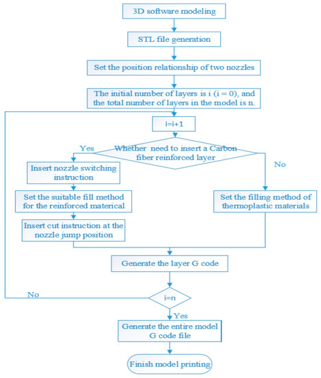 The 3D printing planning process is shown in the Figure 5. First, the models that need to be printed require three-dimensional modeling. After the modeling is completed, the STL file needs to be generated. Then the STL file needs to be processed by the slicing software. The positional distance between the nozzles need to be set first. The number and the position of the layers which need to be printed with the carbon fiber composite material need to be set after that. The filling pattern that suits for the carbon fiber composite material needs to be set, such that the G code file is generated layer by layer. Based on the G code, the entire model is then 3D printed, containing the corresponding carbon fiber selectively reinforced layers. Current commercially available continuous carbon 3D printing technology requires proprietary slicing software to print a model [28]. This software is “closed source” and does not allow for user adjustment of key printing parameters such as temperature, nozzle movement or extrusion speed. This limits the printing capabilities as the printing settings cannot be fully customized [28]. Moreover, for the deposition of carbon fibers, only a circumferential fill pattern is possible which fills the shape from the outside inward in a spiraling motion. This means the fiber is always orientated along the outer perimeter of the part. In contrast to this, the selectively enhanced method reported here, allows for the number and the position of layers for carbon fiber to be flexibly chosen, and for the content of carbon fiber in the reinforcing layer to be adjusted by changing the density of this layer. In here, the fiber content is determined by setting the path filling density. When the filling path density is higher, it means the distance between the two path lines is shorter, so the filling path is denser and filled fibers are more, and the content of carbon fiber is higher. Otherwise, when the filling path density is lower, the content of carbon fiber is lower. The filling pattern for carbon can also be chosen.