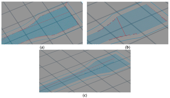 Possible filling patterns: (a) mesh filling; (b) line filling; and (c) spiral offset filling.