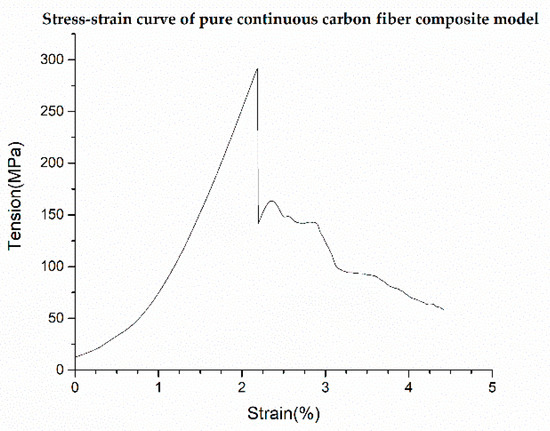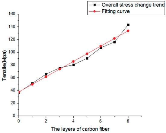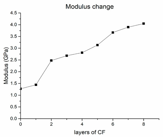 The corresponding stress-strain curves are shown in Figure 10. It can be seen that the tensile strength of the pure PLA test model is 36.89 MPa. For the test model in which 1 layer of continuous carbon fiber composite material is inserted, the number of continuous carbon fiber composite layers accounts for about 5% of the total number of layers, and tensile strength reaches 51.22 MPa, which is 38.8% higher than that of the pure PLA test sample. For the test sample in which 8 layers of carbon fiber composite materials were inserted, the number of continuous carbon fiber composite layers accounts for about 40% of the total number of layers, and the tensile strength reaches 143.11 MPa, which is 287.9% higher than that of the pure PLA test sample. The modulus gradually increases when the number of CF layers increases, as shown in Figure 11. The strength change trend of the test model, in which the continuous carbon fiber composite material is inserted, is shown in Figure 12. The strength increase fitting curve is y = 12.02x + 37.49. The tensile strength of the pure carbon fiber composite material test samples is 291.575 MPa as shown in Figure 13. The result of the 20-layers test model calculated by the fitting curve is 277.89 MPa, which is in good agreement with the experimental value in Figure 13.