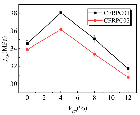 Figure 4 shows the variation law of the influence of the polymer–cement ratio on the compressive strength of specimens. With the increase of the polymer–cement ratio, the compressive strength of the CFRPC01 specimens first increased and then decreased. When the polymer–cement ratio was 4%, the compressive strength of the specimens reached a peak value of 38.1 MPa, which was 10% higher than that of the specimens without emulsion powder. However, the strength of the specimens decreased by 8% as the content of the emulsion powder increased to 12%. Figure 5 shows the variation law of the peak strain of specimens with different polymer–cement ratios in the compressive tests. With the increase of the polymer–cement ratio, the peak strain of the CFRPC01 specimens increased continuously. When the polymer–cement ratio was 4%, 8%, and 12%, peak strain increased by 16%, 22%, and 38%, respectively.