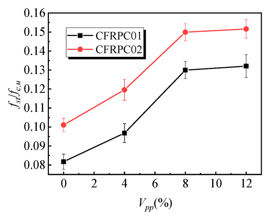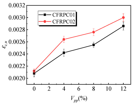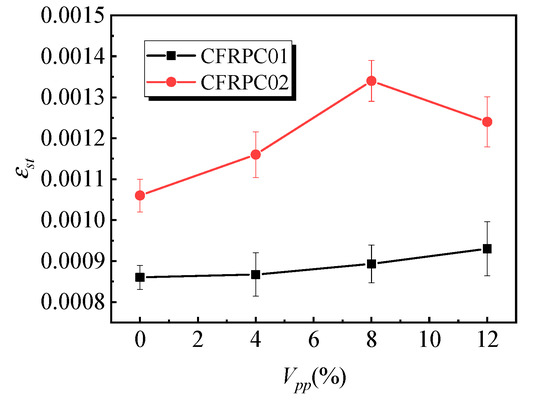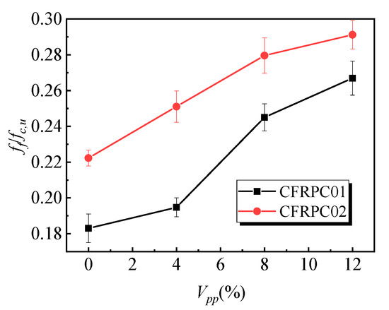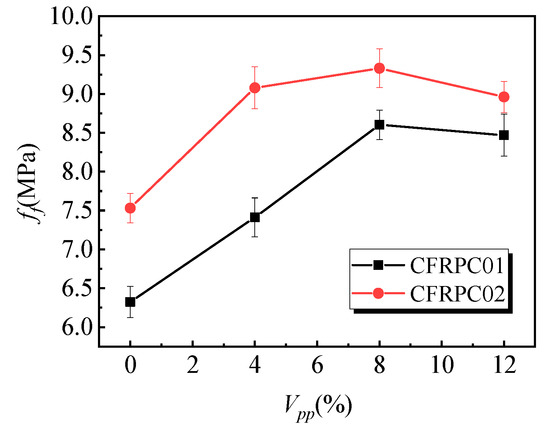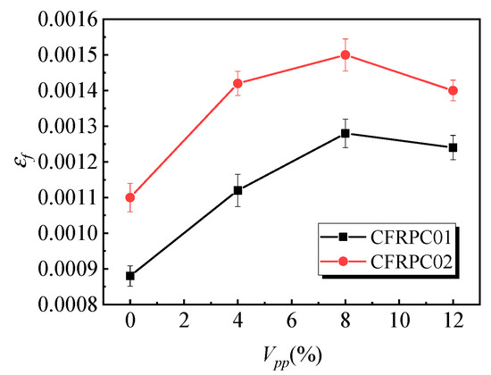 The flexural strength of the CFRPC01 and CFRPC02 specimens reached its peak value when the polymer–cement ratio was 8%, the peak strain first increased and then decreased, and the flexural–compressive ratio kept rising. It shows that the flexural strength of the CFRPC01 and CFRPC02 specimens increased with the increase in the polymer–cement ratio. In addition, with the increase in the polymer–cement ratio, the increase in the flexural strength was greater than that of the compressive strength.