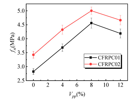 According to the strength test results, adding polymer emulsion powder and carbon fiber is better than adding carbon fiber within the polymer and with a fiber range of reasonable dosage. In other words, the static strength of carbon fiber-reinforced polymer concrete (CFRPC) is better than that of carbon fiber-reinforced concrete. It also proves the rationality of mixing two modifiers (polymer emulsion powder and carbon fiber). The test results were basically consistent with previous research [13,15,21]. This can be explained as follows. The emulsion formed by mixing the polymer emulsion powder with water can assist the dispersion of carbon fibers. The addition of the emulsion has the following functions: