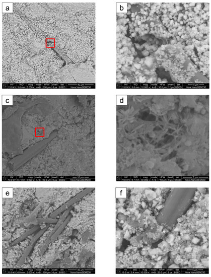 Figure 12d was obtained by enlarging the interface of transition zone in Figure 12c. The magnification of Figure 12c,d was 5000× and 40,000×, respectively. In Figure 12d, it can clearly be seen that the outer side of the carbon fibers was tightly wrapped by the matrix. The micro-structure of the matrix was composed of the cement slurry matrix and the fibrous polymer. The fibrous polymer acted as a “microfiber” across the cracks and pores in the matrix.