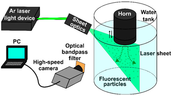 Particle Image Velocimetry (PIV) system was applied to measure the acoustic streaming velocity. Figure 1 is a schematic drawing of the experimental setup. A rectangular glass vessel (W 30 × L 30 × D 40 cm3) was filled with water. Fluorescent particles (FLUOSTAR 0459, Kanomax Japan Inc., Shimizu, Japan) in an amount of 0.1 g were added to the water bath as a tracer. The average diameter of particles was 15 μm, and density was very close to that of water. The sonotrode tip was immersed vertically into the water bath to introduce ultrasonic vibrations followed by generation of cavitation and acoustic streaming. A water-cooled Ar lighting source (Optronics, Co., Ltd, Tokyo, Japan) was exploited to produce a visual laser sheet through the water bath in the immediate vicinity of the sonotrode tip, as shown in Figure 1. A high-speed camera (Photron, Tokyo, Japan) was used to record the tracer particle movement at a frame rate of 500 fps and a shutter time of 1/1000 second. When the fluorescent particles are illuminated by the Ar green light laser (wavelength 550 nm), they emit bright and well discernible light at a wavelength of 580 nm. This technique allowed us to completely eliminate any influence of cavitation bubbles on the PIV measurements. Then, the images taken were processed by a flow analysis software (Library Co., Ltd, Tokyo, Japan) to evaluate the acoustic streaming vector field. Figure 2 show typical results on the distribution of acoustic streaming velocity measured at a vibration amplitude of 50 μm (p-p). A comparison of these results with these published in our earlier paper [12] reveals that the use of fluorescent particles makes it possible to obtain much clearer picture of acoustic streaming vectors even in the immediate vicinity of the sonotrode tip.