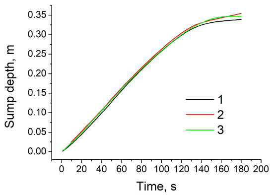 Time variation of sump depth. 1: conventional casting; 2: UST HT castingmaterials-625822 3: UST FRHT casting.