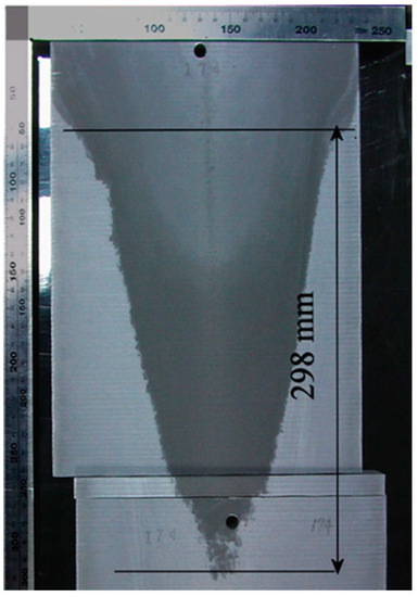 Figure 8 presents the sump depth and profile measured experimentally in the case of UST FRHT casting. The casting conditions were the same as mentioned above. As it was difficult to identify the location of the mold from this picture, the sump depth can be measured only roughly. Under the given conditions, the sump depth is 300 mm approximately. It is to be noted that this value is much greater than those reported in the literature for close sizes of billet and the similar casting speed [25]. This is because in our experiments, a different alloy and much higher temperature of casting was used. However, as can be seen from Figure 8, at the lower part of the sump the mushy zone loses its continuity, suggesting that this is a partly or fully coherent solid part of the mushy zone. Therefore, the depth of sump may be shorter than 300 mm. The black horizontal arrow in Figure 5c shows the point corresponding to the 300 mm depth. It is clearly seen that this point is located inside the predicted mushy zone. This finding suggests a good agreement and predictability for our model. As the mushy zone was interpreted as being a porous solid phase, the predictions of sump depth give underestimated values in the present model. In the actual casting process, as a part of mushy zone is in form of flowable slurry, the actual sump should be deeper.