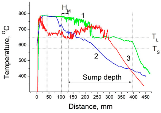 Variation of the melt temperature with distance from the melt surface. 1,2—FRHT without ultrasound irradiation, 3—FRHT with ultrasound irradiation.