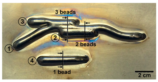 The microstructures of three selected cross-sections, as indicated in Figure 1, were characterized. The location of each cross-section was selected so that the microstructure of different widths (one, two, and three weld beads) of the built material could be characterized. Each sample was mounted, ground, and polished using conventional methods for titanium alloys, and finally, etched with Kroll’s reagent (1 mL HF, 2 mL HNO3, and 100 mL distilled H2O) to reveal the microstructure.