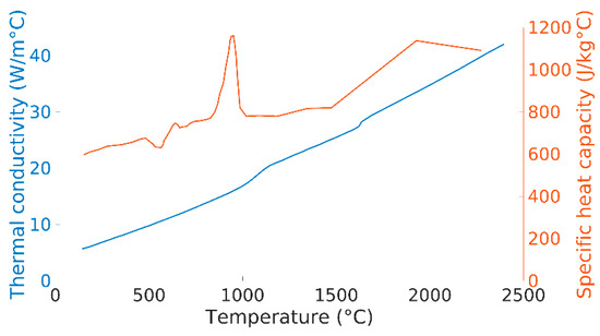 The material data that has been used in the thermal model is from [15]. The thermal conductivity and the specific heat capacity can be seen in Figure 2. Whenever the temperature in the model is outside the given data, a cut-off value is used, i.e., the last known value. A latent heat of 290 J/kg is applied in the transition between the solidus and liquidus temperatures, which are set to 1604 °C and 1700 °C, respectively.