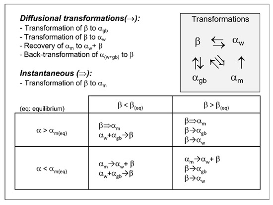 The phase evolution is computed during heating, cooling, and during repeated re-heating and cooling. During heating, when the temperature exceeds about 700 °C, the α phase starts to transform to the β phase [16]. Normally, during AM as well as welding, the heating rates are too fast for an equilibrium to exist. This means that Xβ < Xβ-eq, even at temperatures exceeding the so-called β-transus of the alloy. Above the β-transus temperature at equilibrium, only the β phase exists. During cooling, existing β phase transforms into α phase. For slow to moderate cooling rates, the transformation is diffusion controlled. The initial α phase normally nucleates at the prior β grain boundaries and continues to grow along these grain boundaries before starting to grow into the prior β grains, in a lamellar morphology. This lamellar type of microstructure is called the Widmanstätten microstructure here. For very high cooling rates, non-diffusional transformation of β → α phase takes place; this type of α phase is, therefore, defined as martensitic α, i.e., the microstructure will be martensitic. For moderate to high cooling rates, a massive transformation of β → α can occur [17]. This transformation is not included in the model. Solid–solid phase changes, on heating as well as on cooling, are mostly characterized by transformation mechanisms of nucleation and growth processes. The β phase decomposition to α Widmanstätten and α at prior β grain boundaries, as well as the β formation during heating, are all diffusion-controlled processes [18]. In contrast, α martensite formation from the β phase is a diffusionless transformation.