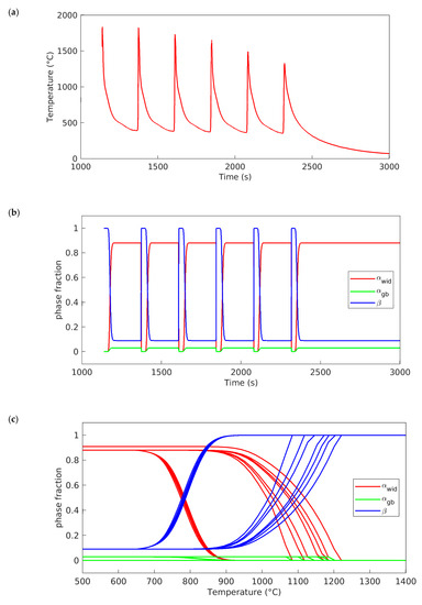 The additive manufacturing process is characterized by cyclic temperature variations, leading to repetitive phase transformations and microstructural changes in the deposited material and substrate. Temperature history is thus the main factor when modeling the microstructure. Continuous microstructural modeling allows for the microstructural changes that occur during processing to be followed. While microstructural analysis provides information about the results after the additive manufacturing process, the microstructural model, by following the entire deposition process, gives continuous information about the microstructure changes during the additive manufacturing process. The temperature history experienced at a selected point during additive manufacturing (see Figure 7a) is representative of a typical temperature profile experienced by the deposited material. The location of this point is in area B in the single weld bead sample in Figure 5. In Figure 7b,c, the simulated phase transformations versus time and temperature, respectively, can be seen. As explained earlier, during cooling, the β phase transforms into a mixture of αgb and αwid. The phase fraction of each microconstituent depends on the cooling rate, i.e., a faster cooling rate promotes more αwid than αgb, and vice versa. During the following heating sequence, the αgb and αwid transform to the β phase, which cyclically transforms again to αgb and αwid over the temperature history. It is important for the numerics in the microstructural model that the temperature change during a time step is not too large. Therefore, an internal time sub-stepping logic was developed to control this. In the current work, a maximum temperature change within the phase transformation region of 5 °C is allowed. If the temperature change in the thermal solution exceeds this value, the time step will be subdivided internally. The authors have observed that, for this specific set-up, the model yields a slightly different result when using the sub-stepping logic during the heating cycle. However, during the cooling phase, they are nearly identical. For another type of AM process, e.g., powder bed, the sub-stepping logic is probably of more importance, as the cooling ratios are much higher.