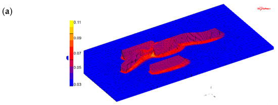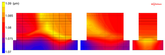 Figure 8 and Figure 9 show the simulated results of the α lath thickness. Despite the simplicity of the chosen model, the simulation results agree well with the experimental measurements. The simulated thickness, evaluated to be approximately 1.1 µm, is in agreement with the 1.0 to 1.1 µm obtained by microstructural analysis. It is also interesting to note that the α lath thickness shows a tendency to increase with increasing wall width, i.e., when built with more weld beads. A similar trend is found in the experimental evaluation.