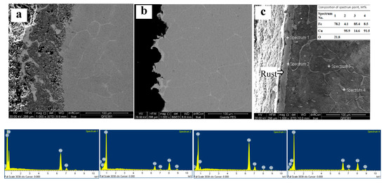 Figure 1b show that oxygen is distributed mainly in the rust layer, which is the outermost layer of the sample, and the oxides are mostly iron oxides. The distribution of copper matches well with the BSE morphology where there is a little copper in the outer rust layer, and there is no phenomenon of copper diffusing from the inner substrate. Therefore, the aggregated copper comes from the oxidized substrate surface, which then becomes the later rust layer. Copper segregates during the oxidizing process, and the quantity of aggregated copper is related to the thickness of oxidized substrate and copper content in the substrate.