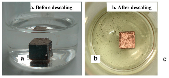After heating at high temperature, the steel surfaces were treated with rust removal. The rust solvent was 30 g of citric acid and 50 g of sodium dihydrogen phosphate anhydrous, dissolved in 1 L of deionized water. The pH value of the descaling reagent measured by digital pH tester (MesuLab, Guangzhou, China) was about 1.6 and the descaling process lasted 24 h at room temperature.