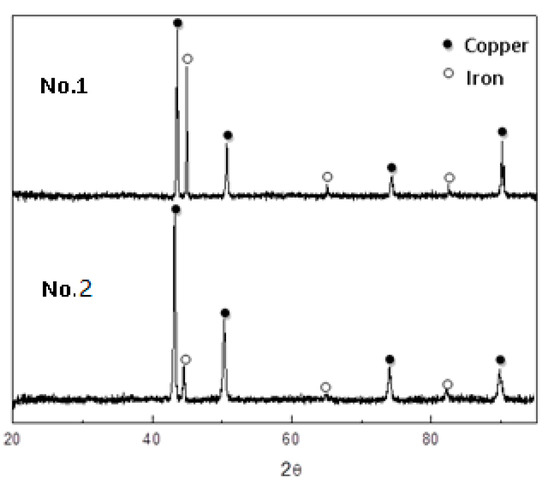 Figure 4 shows the XRD patterns on the surfaces of steels 1 and 2 after descaling. XRD test results show that the surfaces of the descaled steels were made up of pure copper and pure iron, and that pure copper was the main ingredient. The copper content in bulk steel 1 was much lower than that in steel 2, while the composition of the descaled surface was similar. In other words, the descaled surface of steel 1 was also covered mainly with copper. There was no ferric oxide identified by XRD.