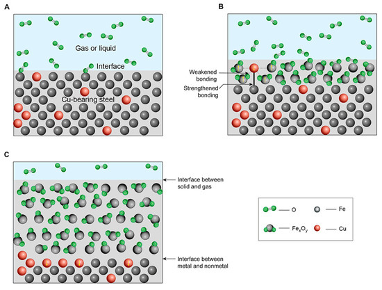 The bonding force between metallic atoms is stronger than that between the metal and oxide atoms. With the oxidation of the steel surface, the bonding force between the unoxidized copper atoms and the surrounding oxide molecules weakens, while the bonding force between copper atoms in the oxide layer and the adjacent iron (and/or copper) atoms in the matrix is strengthened even with increasing distance, as shown in