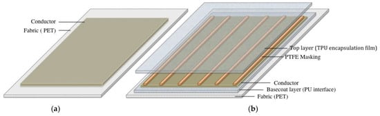 Illustration of the coated samples with different constructions: (a) conductor on plain fabric and (b) layered construction of an encapsulated conductor with PTFE masking prepared for washing treatments.