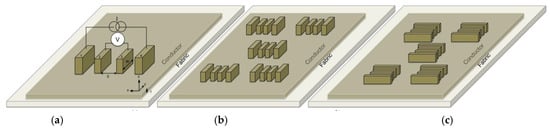 Figure 1a shows and illustration of coated samples with the conductor applied directly on top of the fabric (series: Cu_05, Cu_20, Cu_50, and Cu_200; CuMF_05, CuMF_20, CuMF_50, and CuMF_200; and Ag_05, Ag_20, Ag_50, and Ag_200), sample notations are further explained in Table 1. Fabric substrates of 20 × 30 cm2 were attached to an even surface, and the formulation was manually applied using a film applicator (ZUA 2000, Zehntner GmbH Testing Instruments, Sissach, Switzerland) using a procedure similar to the knife-over-blanket technique. Samples with four different gap heights (h) of 5, 20, 50, and 200 μm were prepared with a coating speed (v) of 0.6 m/min. The corresponding shear rates, drying and annealing conditions in a low convection heat oven (D-36-03-EcoCell, Rycobel NV, Deerlijk, Belgium) are shown in Table 1. The shear rate was calculated according to: