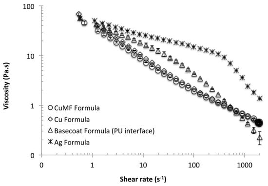 At lower shear rates, the viscosity of the Ag formulation was higher than that of the Cu and CuMF formulations, and with increased shear rates up to 300 s−1, the shear thinning behaviour was less steep, showing a more Newtonian profile, i.e., the viscosity was less influenced by the shear rate. This indicates that the binder polymers within the Ag formulation are of high molecular weight and long enough that polymer entanglement restricts their alignment in the flow direction with increased shear rates up to 300 s−1. However, at increase shear rates, a more pseudoplastic behaviour was pronounced.