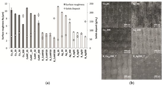 (a) Surface roughness of the conductor layers and solids deposition depending on the formulation and gap height. Individual standard deviations were used to calculate the intervals, and the plot displays a 95% confidence interval (CI) for the mean. (b) Scanning electron microscopy (SEM) images of samples coated with the Cu and Ag formulations showing the mass per unit area in brackets Cu_05 (64 g/m2), Cu_200 (180 g/m2), B_CuMF200_T (166 g/m2), Ag_05 (47 g/m2), Ag_200 (160 g/m2) and B_Ag200_T (149 g/m2).