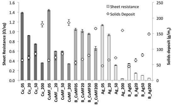 Sheet resistance and solids deposition for all samples using the inline four-point probe configuration. In this diagram, the thickness of the encapsulated conductor is not taken into account; thus, the Rsh instead of the bulk resistivity is displayed.