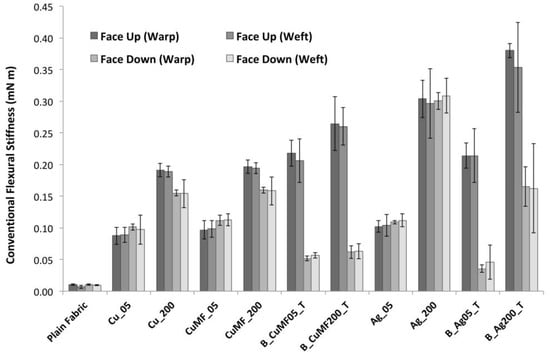 The fabric stiffness in terms of conventional flexural stiffness of the plain and coated fabrics with the lowest and highest amount of solids deposition (generated from a gap height of 5 and 200 μm) is presented in Figure 6, showing average values in the warp and weft direction, as well as in the face up and down orientation. For the plain fabric, no significant difference in the flexural stiffness in the warp and weft direction or the face up or down orientation of the samples was observed. This means that fabric anisotropy because of differences in thread count did not influence the fabric stiffness. Furthermore, it shows that the addition of the MF did not impact the fabric stiffness, as the confidence intervals overlapped for the Cu and CuMF samples within the same gap span. For all samples, increased deposition lead to a substantial increase in flexural stiffness, as shown by the flexural stiffness values starting from ~0.01 mN m for plain fabric and increasing by a factor of 10 for the samples with the least deposition and almost doubling for the samples with the most deposition. The layered B_Ag200_T samples had the highest flexural stiffness values of ~0.38 mN m. Most certainly, this stiffening behaviour would decrease the drapeability and comfort, even when these types of formulations are printed instead of coated as in this study, provided that the same amount of deposition material is used.
