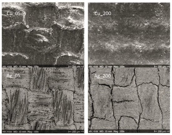 In Figure 7, the SEM images show the surface appearance of plain Cu- and Ag-coated samples after five washing cycles. These samples were produced with the lowest (5 μm) and the highest (200 μm) coating gaps and showed major differences in appearance. The encapsulated samples did not visually show any significant differences before or after the washing procedure and are therefore not included in this section. In general, the washing procedure affected the surface appearance of the plain-coated fabrics to a large extent. The Cu_05 samples with the lowest deposition displayed a film topography with a larger degree of roughness compared to the untreated sample (for comparison, see Figure 4). The surface showed an embossed character where the boundaries between the filament yarns are constituted. Apparently, this is a combined effect from the harsh mechanical treatment in the drum and the chemical and wetting processes during the washing cycles. A similar topography was seen for samples with the lowest deposition and containing the cross-linker; thus, the addition of a MF did not visually influence the conductor resistance to washing. However, with increased deposition, as seen for washed Cu_200, the topography was unaffected and was similar to the untreated sample. One can argue that thicker conductive coatings with an increased amount of deposited solids and a smoother topography generally withstands the mechanical abrasions in the drum to a larger extent. The SEM images of the Ag-coated topography show clear visible cracks for both Ag_05 and Ag_200. Increased amounts of Ag formulation did not improve the resistance to washing.