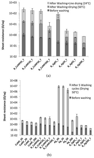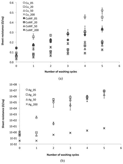 Sheet resistance of (a) the plain Cu and CuMF formulation and (b) the Ag-coated samples before and after five washing cycles. Error bars represent 95% CI for the mean, and individual standard deviations were used to calculate the intervals.