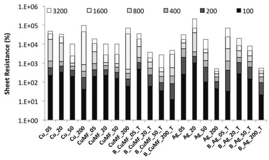 The effect of abrasion on the Rsh for samples with different formulations and layered constructions is shown in Figure 10. A trend in increasing Rsh with an increasing number of abrasion cycles is observed for all samples. For most samples, the total increase in Rsh after 3200 abrasion cycles was between two to three orders of magnitude, except for the silver-coated samples with a larger amount of coating (Ag_200 and B_Ag200_T), where the increase was below one order of magnitude, maintaining values below 0.4 Ω/sq. For the plain-coated Cu and CuMF samples, the Rsh values did not significantly differ with increased abrasion cycles depending on the added cross-linker. This means that neither the physically dried nor the possibly cross-linked conductor was sufficiently stable to withstand distortion from repetitive abrasion cycles in a meaningful way. Compared to the plain-coated Cu and CuMF sample series, the encapsulated samples showed a more gradual increase in Rsh with increased amount of conductor, depending on the gap height (5, 20, 50 and 200 μm) and the number of abrasion cycles. Furthermore, the total increase in Rsh was approximately 1.2 orders of magnitude, at least for the B_CuMF_T samples with an increased gap between 20–200 μm compared to the plain-coated samples within the same sample series for which the total increase in Rsh was closer to two orders of magnitude. Thus, the encapsulated conductor in the CuMF formulation with a solids deposition from 67 to 166 g/m2 (see Table 1) withstands abrasion cycles to a larger extent compared to the plain-coated conductors within similar ranges of solids deposition.