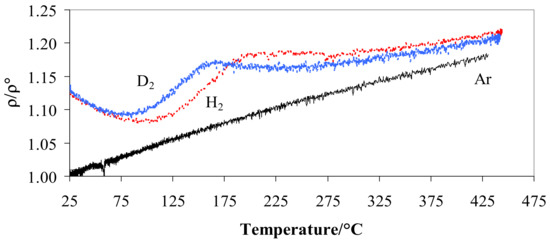 When the metal is hydrogenated or deuterated, the resistivity depends on the amount and kind of isotopes, gas pressure, and operating temperature [29]. Figure 3 shows the ratio ρ/ρ° resistivity vs. temperature at 100 kPa in hydrogen and deuterium compared with the trend in argon. Figure 3 highlights the relationship between ρ/ρ° and temperature in hydrogen, deuterium, and argon at a pressure of 100 kPa.