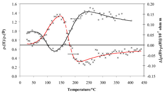 Figure 5 depicts the resistivity isotopic effect expressed as the ratio of the values for hydrogen and deuterium, ρi, (left-axis) and their differences (right-axis). The isotopic effect on resistivity expressed by ρi is negligible at low temperature (ρi is close to 1) but, at about 70 °C, the effect becomes negative (ρiD > ρiH), and after the minimum at 125 °C it increases again, being positive over 160 °C (ρiH > ρiD), achieving a maximum value of 1.41 at about 250 °C and then decreasing above this temperature to a constant value (1.20).